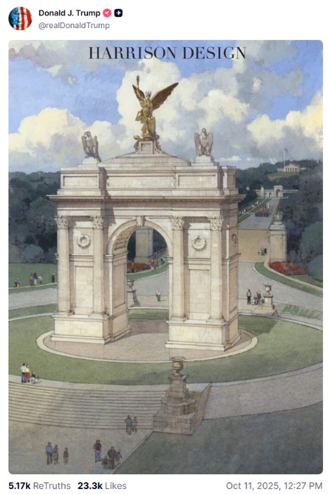 根据特朗普转发的设计图,这座“特朗普凯旋门”上装饰有老鹰雕像以及一个镀金的胜利女神像。