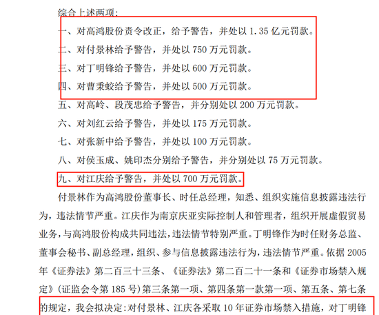 其中,高鸿股份被判1.35亿,其中欺诈发行判罚募资额的10%即1.25亿;时任董事长或总经理的付景林负主要责任,给予罚款750万元的同时,市场禁入10年;财务总监、董秘、副总的丁明锋被处以600万罚款,市场禁入5年;第三方帮凶处以和付景林一样的处罚,700万+10年市场禁入。