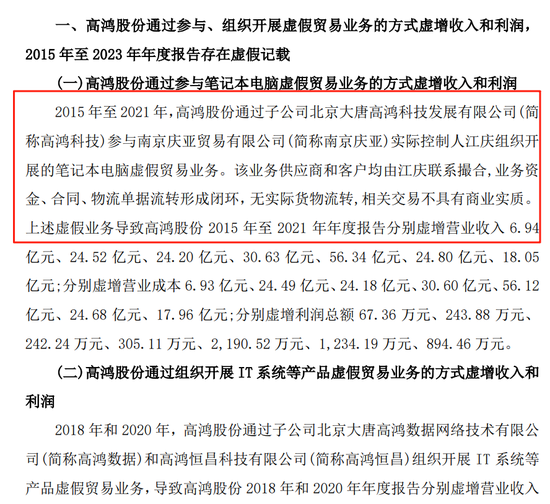2015年至2021年,高鸿股份通过子公司高鸿科技参与南京庆亚实际控制人江庆组织开展的笔记本电脑虚假贸易业务。该业务供应商和客户均由江庆联系撮合,业务资金、合同、物流单据流转形成闭环,无实际货物流转,相关交易不具有商业实质。
